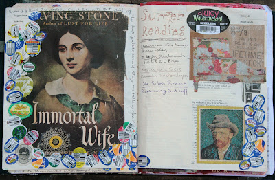 A couple of weeks ago I decided that I needed to know how many pages I have done in my journal since I started painting the pages with acrylic paint and thus bridging over to being a visual journaler, never to turn back. As I was counting (and perusing) my old journals, volumes 1 to the current volume 9, I also decided to count the postage stamps and fruit stickers that are a constant add-in for me. I wound up with 1,385 pages. Part of what got me interested in finishing this task was mentioning that I thought I had only done one spread totally without words. As I was going through I actually found two spreads. The second one only has the date on it. I guess I'm just a wordy kind of girl.